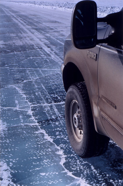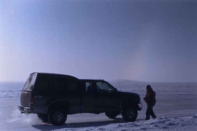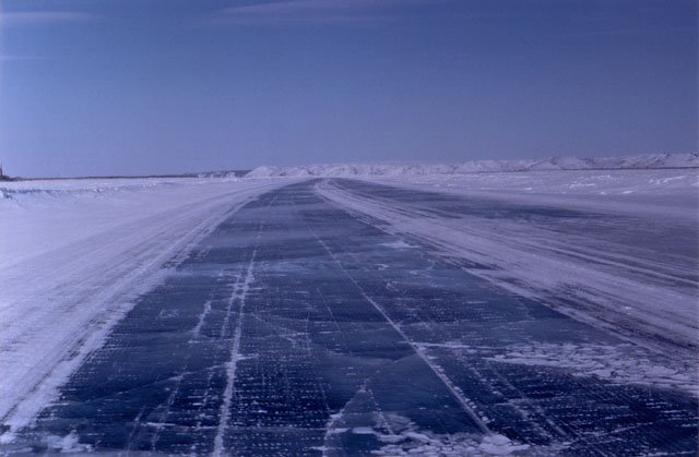 On March 23, 2002, a friend and I flew from Vancouver, British Columbia, to Whitehorse, Yukon Territory. We then spent the next week on a road trip from Whitehorse to Tukoyaktuk, Northwest Territories, on the Arctic Coast. March is still the end of winter up there, and the last 160 km (100 miles) were on the frozen Mackenzie River Delta and Arctic Ocean. Here's a map of the Dempster Highway and ice road.